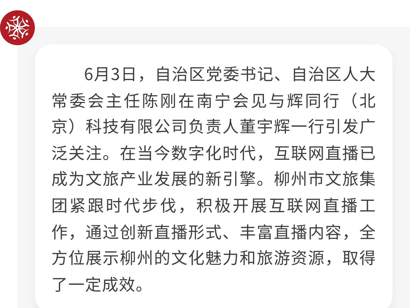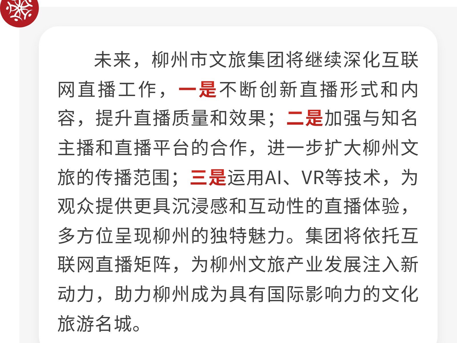 柳州市文旅集團(tuán)積極探索互聯(lián)網(wǎng)直播矩陣,助力城市文旅新發(fā)展 發(fā)布時(shí)間:2025年06月12日 20時(shí)來源:本站原創(chuàng)瀏覽:89 人次